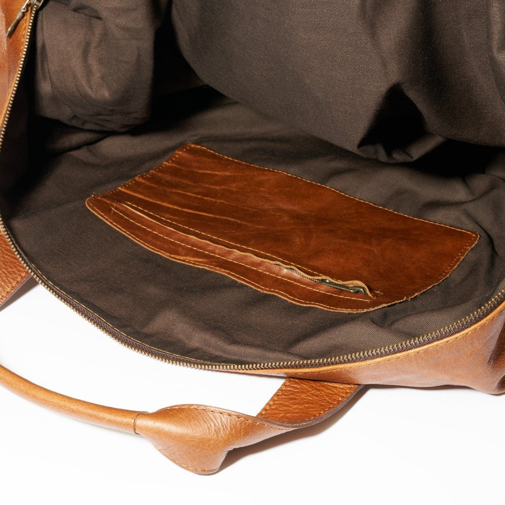 Interior view with inside compartment and zipper closure on Elliot Duffel Bag-Pecan