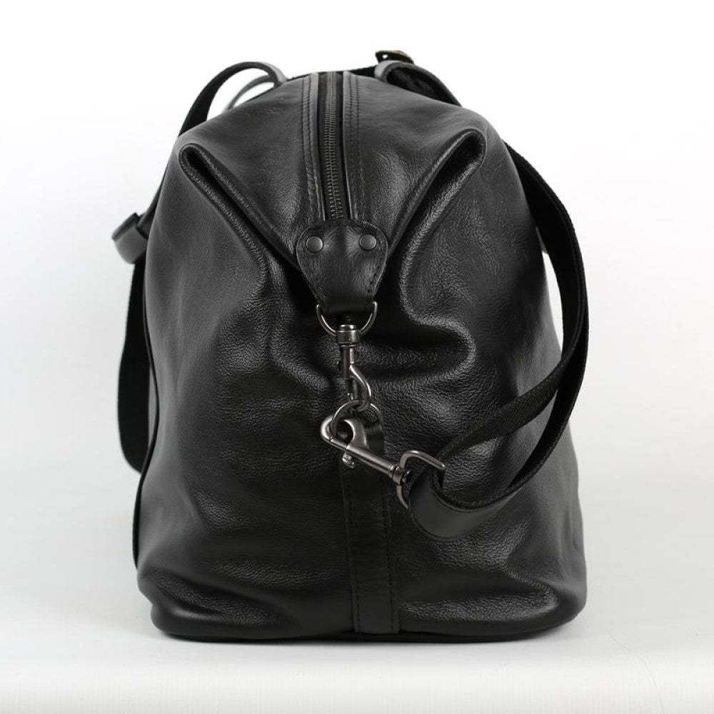 Side view of steel clasps attached to strap on Elliot Duffel Bag-Black